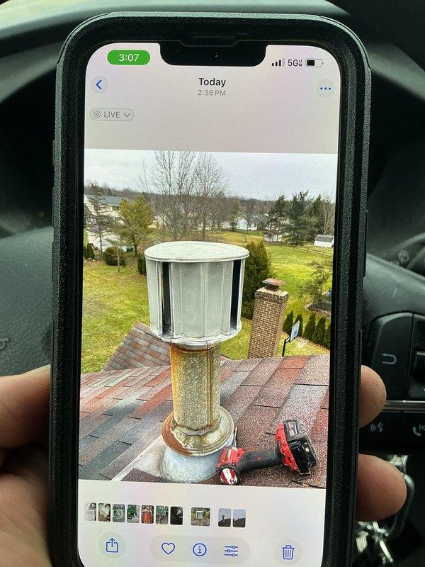 Responded to service call for missing furnace vent cap on roof. Assessed situation and confirmed wind had dislodged the B-vent termination cap from flue pipe. Reinstalled and secured proper chimney cap to prevent future displacement and ensure safe venting of combustion gases.