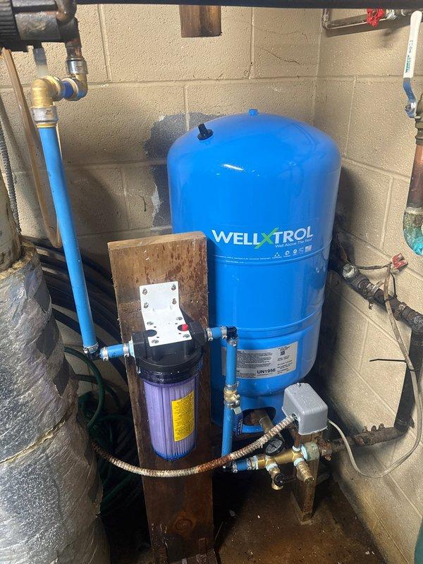 Completed pressure tank installation with new Well-X-Trol unit mounted to basement wall. Connected system to existing water filtration setup and verified proper pressure regulation. All connections tested and system functioning correctly.