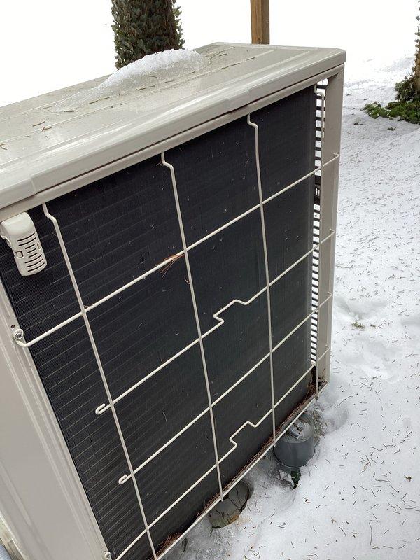 Performed scheduled annual maintenance on customer's ductless split heat pump system. Inspected outdoor unit which showed proper installation on concrete pad with adequate clearance. Unit was operational with no visible damage to condenser coils despite winter snow conditions.