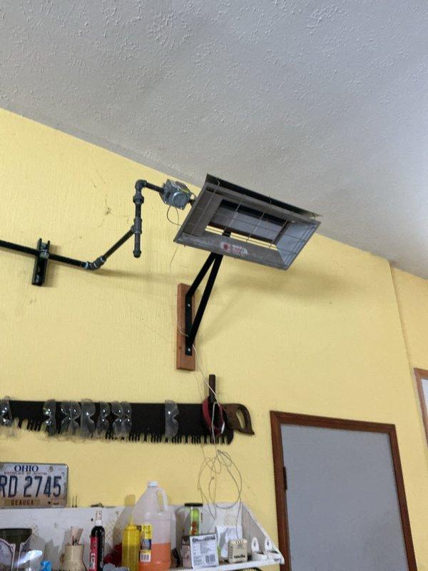 Responded to follow-up call for LP gas changeover. Inspected wall-mounted heating unit and associated gas line system. Verified proper installation of hinged bracket mounting and confirmed unit's operational status after conversion.