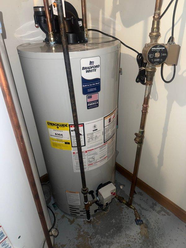 Successfully installed a new 50-gallon Bradford White power vent hot water heater, complete with all necessary copper piping connections and circulation pump. Verified proper operation of the unit after installation and ensured all connections were secure with no leaks.