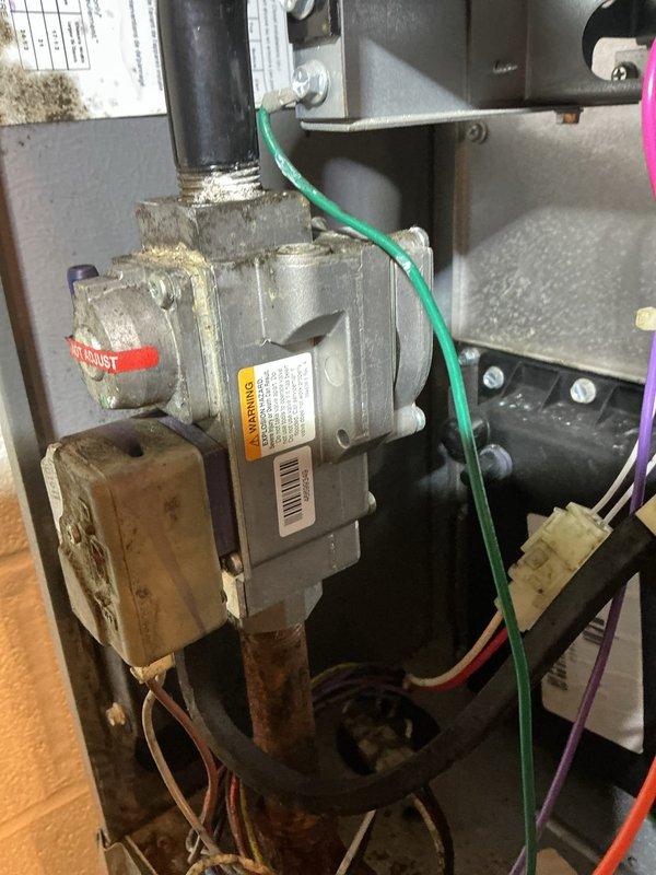 Responded to no-heat complaint on 10-15 year old gas furnace. Inspected gas valve assembly which showed signs of wear and corrosion. Repaired faulty wiring connections at the gas valve, cleaned accumulated dust/debris, and restored proper heating function.