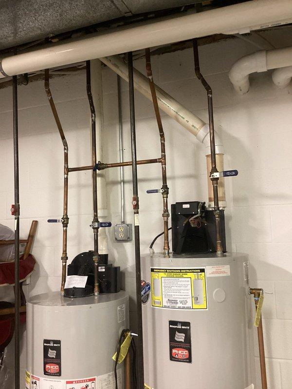 Completed maintenance service on dual water heater system. Inspected both tanks, checked connections, and verified proper operation of shutoff valves on the copper distribution lines. Customer notified of completed service.