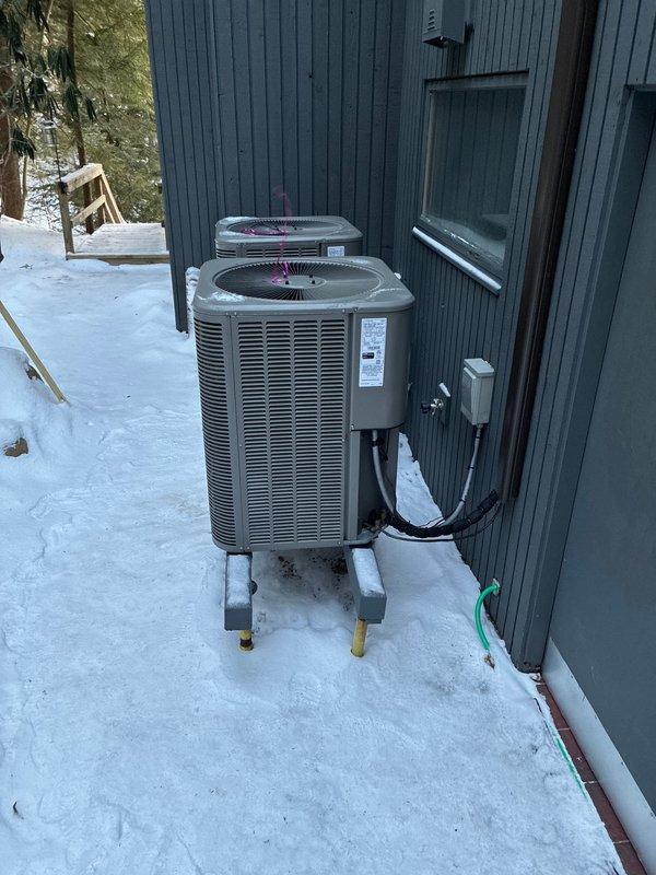 Conducted assessment of dual heat pump system where one unit has failed. Both outdoor condensers are installed on concrete pads adjacent to the building with proper electrical and refrigerant connections. Recommended replacement of the non-functional heat pump with compatible equipment to restore full system operation.