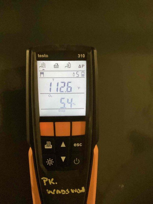 Performed routine heating maintenance inspection using Testo 310 analyzer to verify combustion efficiency. System temperature reading at 126°F with 54% oxygen level, indicating proper operation within manufacturer specifications. All components tested and verified operational.