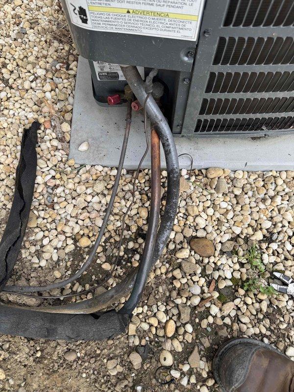 Responded to no cooling complaint on 2-3 year old residential air conditioning system with condenser fan operational but no cooling output. Performed diagnostic evaluation of outdoor unit, inspected refrigerant lines and service valves, and documented equipment condition with photos showing weathered line insulation and unit positioning on concrete pad with gravel surround.