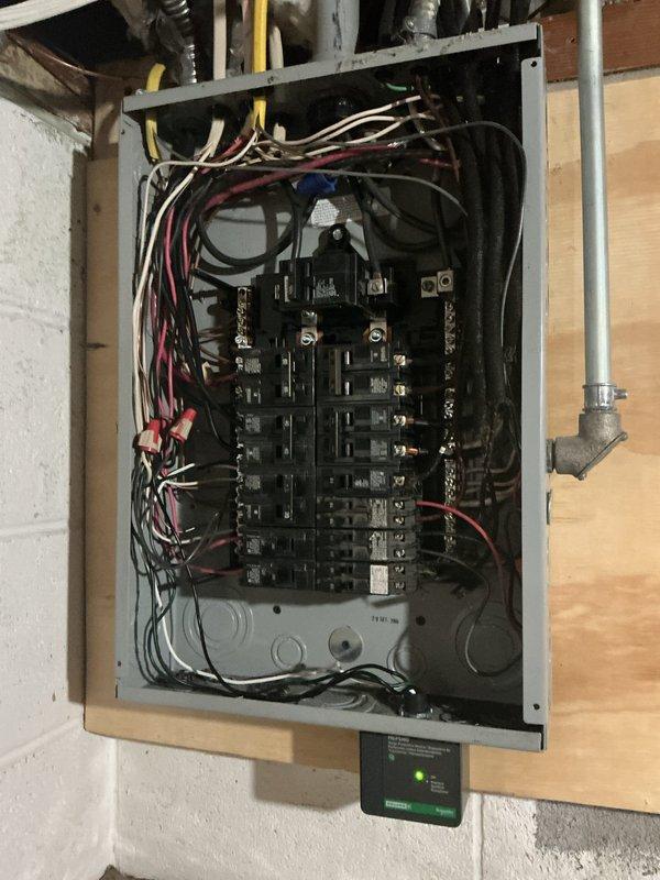 Installed whole home surge protector at residential property. Mounted device at bottom right corner of main electrical panel with visible status indicator light. System now operational, providing protection against power surges throughout the dwelling.
