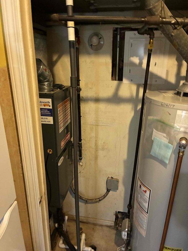 Conducted full system inspection of existing forced air HVAC equipment including outdoor AC condenser unit showing signs of weathering and environmental exposure. Evaluated current ductwork configuration and drainage system consisting of PVC piping and metal hanging hardware in utility area. Presented replacement options for complete HVAC system and hot water tank to improve efficiency and reliability.