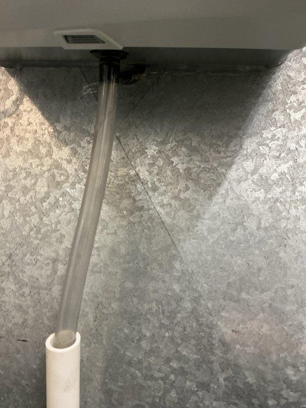 Conducted site assessment for customer's humidifier installation request. Inspected existing ductwork and connection points, noting the current ventilation system includes a ceiling-mounted air register connected to a translucent tube that feeds into a white cylindrical conduit. Evaluation completed to determine appropriate humidifier specifications and installation requirements.