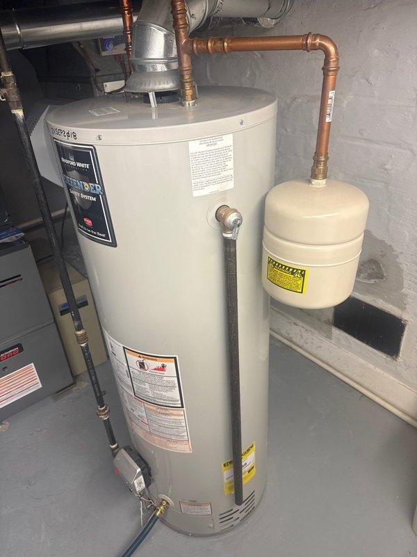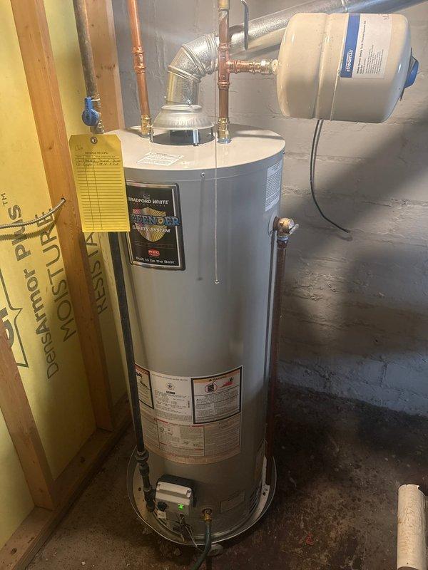 Completed water heater installation in basement utility area. Installed Bradford White unit with proper copper piping connections and ventilation system. Mounted expansion tank above unit and attached inspection tag to verify completed work.