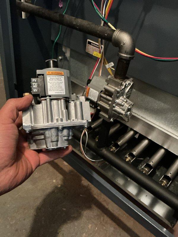 Returned to property to replace defective gas valve on furnace as per warranty service. Removed existing valve assembly and installed new OEM replacement valve. Tested system operation after installation to confirm proper gas flow and ignition sequence.