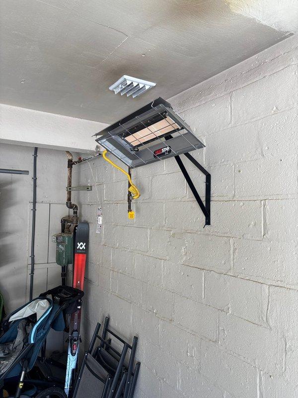 Successfully completed garage heater replacement, installing a wall-mounted gas infrared heater with proper bracket support. Connected unit to existing gas line and verified proper operation with visible heating elements functioning correctly.