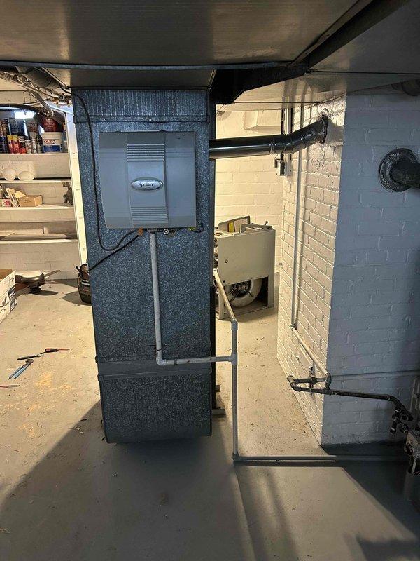 Successfully installed new 80% efficient furnace in basement utility room. Complete installation includes properly routed PVC piping and connection of Aprilaire humidifier controller. All systems functioning as designed with clean, organized final installation.